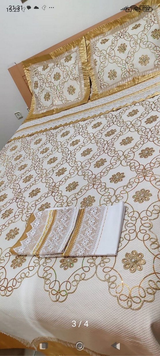 Altın ve bej tonlarında detaylı nakışlı desenlere sahip, vintage ve sade bir görünüme sahiptir. Geleneksel ve şık tasarım.