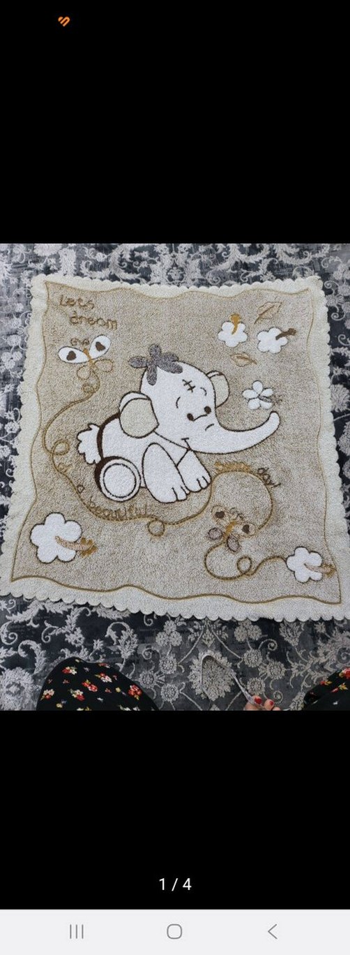 açık kahve renkte, yumuşak ve sıcak dokulu kumaştan yapılmış, fil ve çiçek desenli nakışlı çocuk battaniyesi.