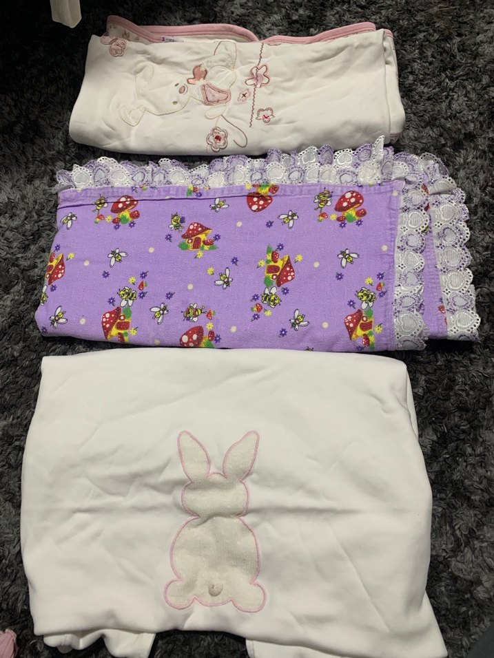 Yumuşak tekstil malzemeden yapılmış, dantel uçlu, mantar ve çiçek nakışlı mor pastel çocuk battaniyesi. 3 adet bebek battaniyesi