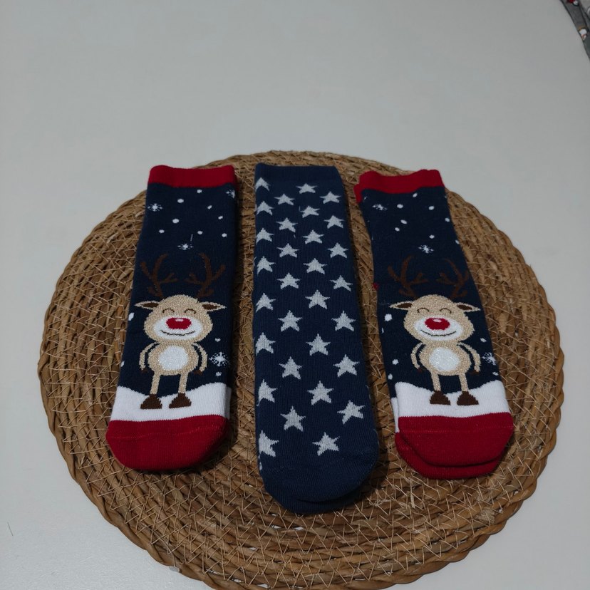 Yumuşak ve sıcak tüylü kumaştan yapılmış üç çift çocuk çorabı seti. İki çift koyu zeminde nakışlı geyik desenli, kırmızı ve beyaz detaylı, diğer çift yıldız desenlidir. Geyik desenli çorapların bedeni 27 - 30 arasıdır.