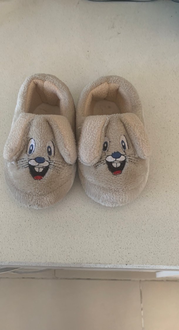 Nakışlı tavşan yüzü ve kürk detaylı, yumuşak peluş kumaştan yapılmış bej çocuk ev terliği. Sıcak tutar ve rahat kullanım sağlar.