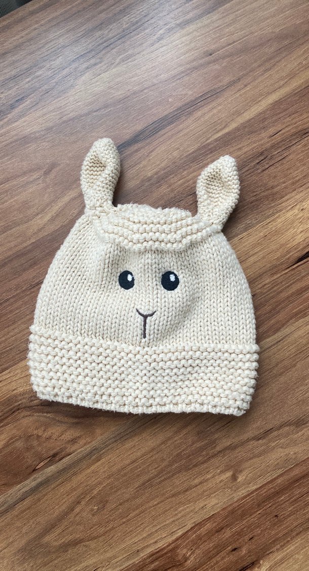 Açık bej renkte, nakışlı yüz ve iki sevimli kulak detaylı çocuk örgü bere. 6-9 AY. Kız-Erkek