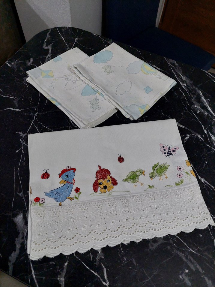 Beyaz kumaş üzerine nakışlı hayvan ve böcek desenleriyle renkli, dantel detaylı çocuk uyku tekstili, yumuşak tekstil malzemesinden üretilmiştir. İki adet yumuşak dokulu kumaştan bir adet el işi nakış bebek yastıkları Çok kısa bir süre kullanıldı ve bir deformeleri yoktur Üçlü fiyattır Açıklamayı dikkatli okuyup alım yapınız İade kabul etmiyorum