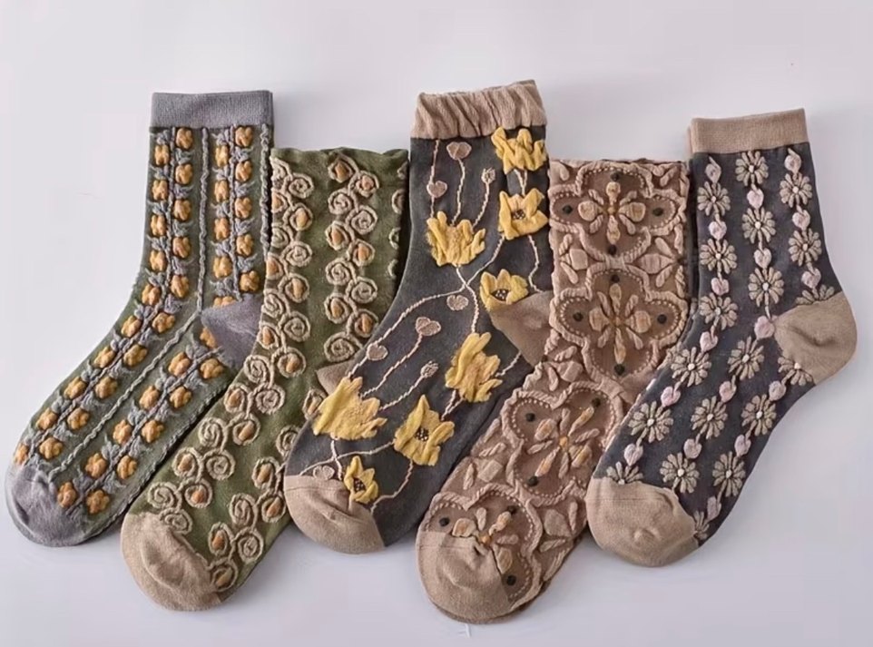 Yumuşak örme kumaştan yapılmış, çok renkli ve nakışlı çiçek desenli kadın çorabı. 3 boyutlu kabartmalı