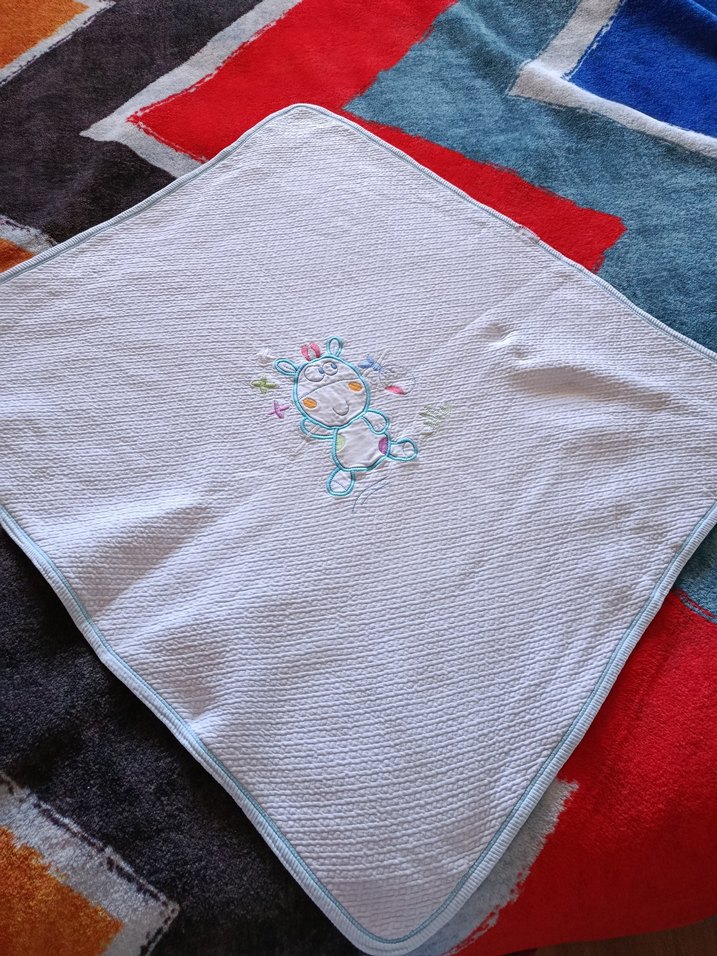 Nakışlı detaylara sahip çok renkli bebek battaniyesi, yumuşak ve sıcak bir kumaştan üretilmiştir.