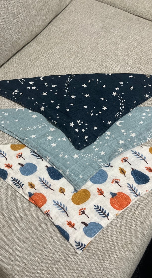 Nakışlı desenlere sahip koyu renkli çok renkli bebek önlükleri, yıldızlar, aylar ve sonbahar temalı baskılar içerir. Yumuşak ve rahat kumaştan yapılmıştır.
