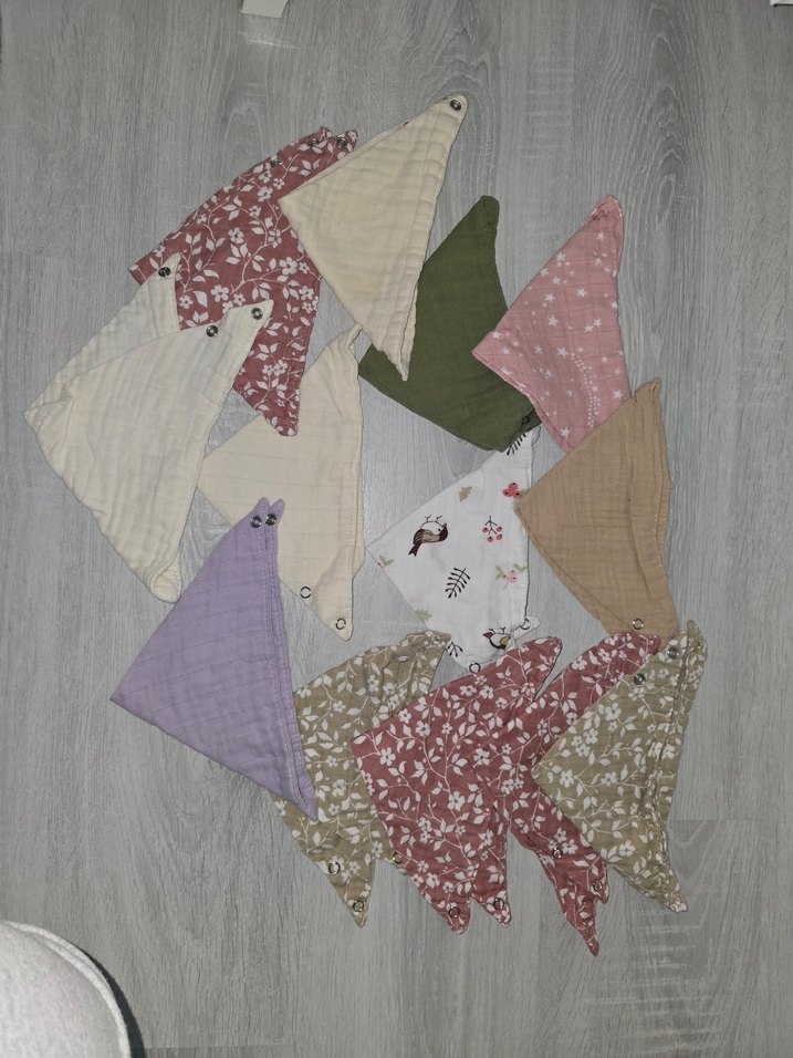 Çok renkli ve nakışlı desenlere sahip, yumuşak dokulu, açık renk bebek önlükleri.