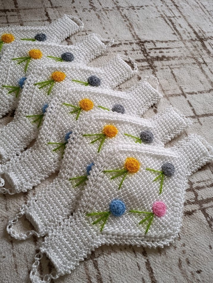 Çok renkli çiçek nakışlı, yumuşak gri tonlu, dokulu ve el yapımı görünümlü bebek önlüğü. Loop kapamalı.
