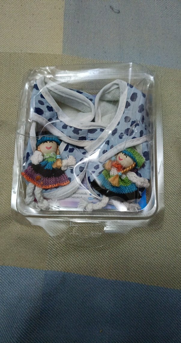 Nakışlı desenli, açık renkli bebek önlüğü. Üzerinde iki küçük süs bebeği bulunur. Yumuşak kumaştan yapılmıştır.