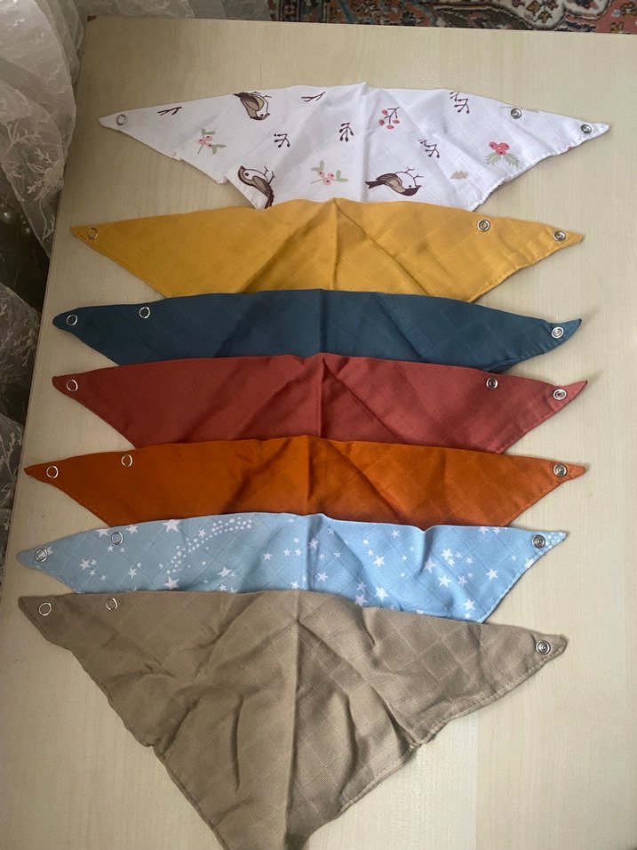 Çok renkli, nakışlı ve çıtçıtlı bebek önlükleri seti. Yumuşak kumaştan yapılmıştır ve bebekler için uygundur.