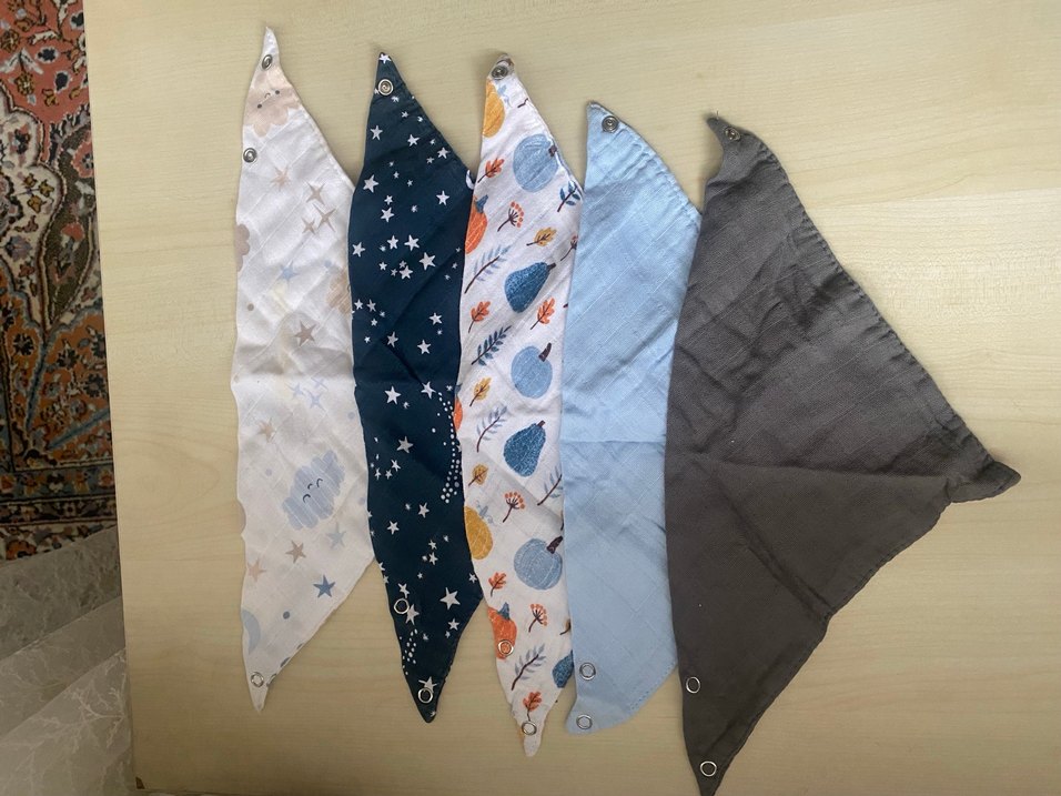 Çeşitli desenlerde ve renklerde, nakış detaylı beşli bebek önlüğü seti. Her önlük kolayca kapanan çıtçıt düğmelidir.