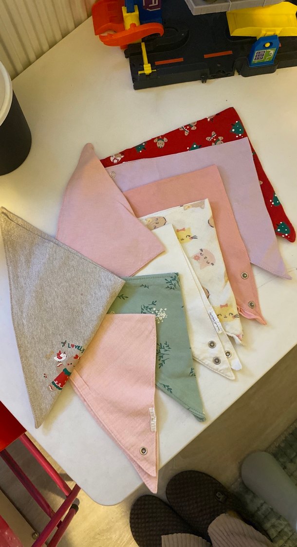 Nakışlı desenlere sahip, çeşitli pastel renklerde yumuşak kumaştan bebek önlükleri. Kolay kullanım için çıtçıtlı.temiz kullanıldı sadece bir kaç tanesinde hafif bi lekelenme var oda yıkanınca çıkar diye düşünüyorum