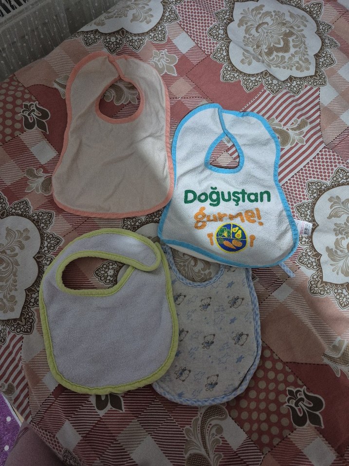 Nakışlı ve "Doğuştan" yazılı desenli, pastel renklerde dört adet bebek önlüğü seti. Yumuşak ve konforlu kumaş.