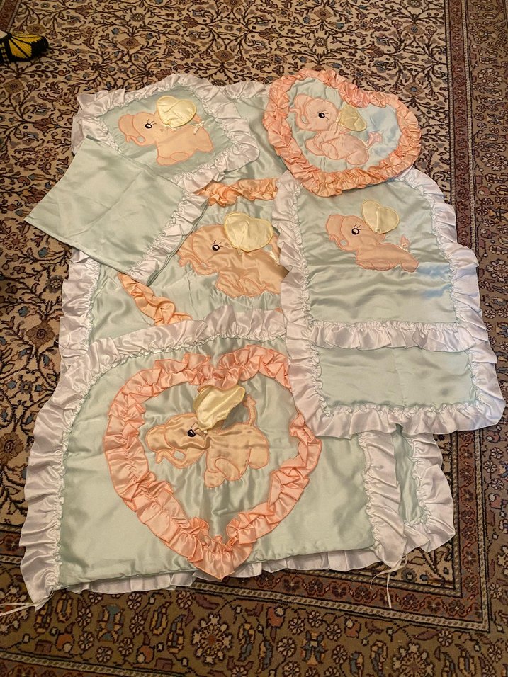 Nakışlı fil desenleri ve fırfırlı kenarları olan, pastel tonlarda çok renkli saten kumaştan yapılmış bebek takımı