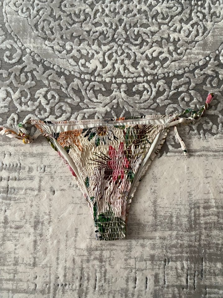 Nakışlı, boncuk detaylı ve ayarlanabilir yan bağlamalı, hafif çok renkli desenli, bohem tarzda dar kesim bikini altı. M L beden