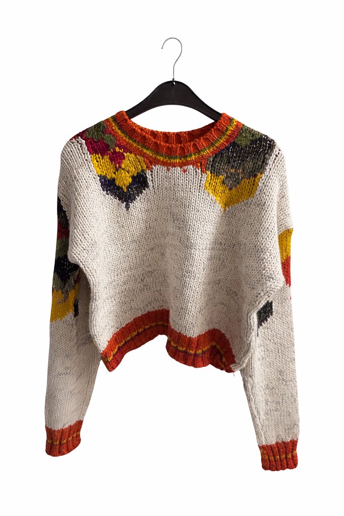 Bu kadın kazağı, bol kesim, uzun kollu ve yuvarlak yakalıdır. Örgü kumaştan yapılmış, çok renkli nakışlı desenler ve kısa boy ile bohem tarzını yansıtır. Rahat ve günlük kullanım için uygundur.