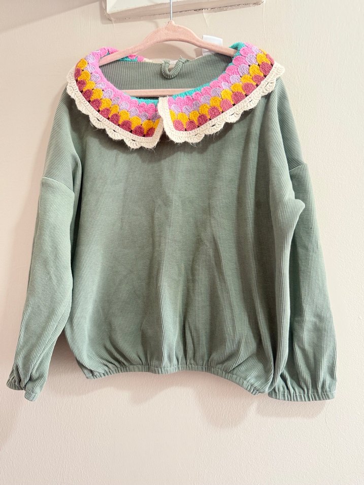 Rahat kesim, uzun kollu kız sweatshirtü, yakasında çok renkli nakışlı örme detaylar bulunur. Yumuşak triko kumaştan, pastel tonlarda.