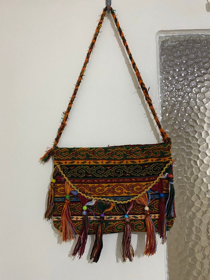 Bu bohem tarzı çanta, koyu renkli çok renkli nakışlı tekstil ve püsküller ile birlikte örgülü askıya sahiptir. Günlük kullanım için uygundur.