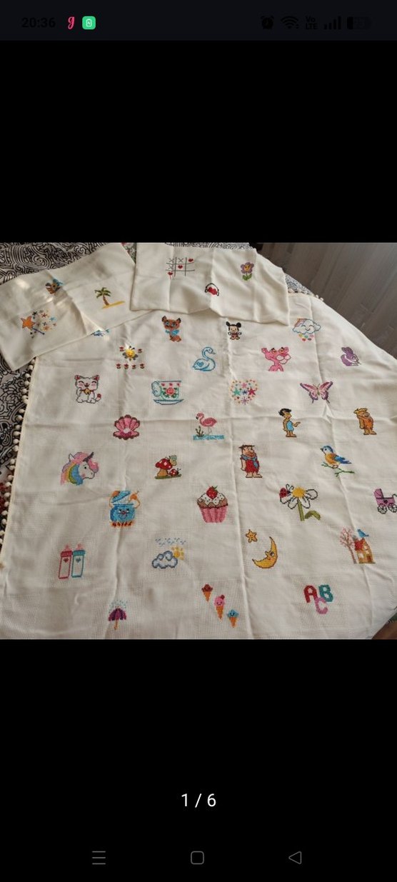 Çocuk battaniyesi, çok renkli nakışlı hayvanlar, çiçekler ve eğlenceli desenlerle açık renkli tekstilden yapılmıştır. el emeğidir hiç kullanılmadı