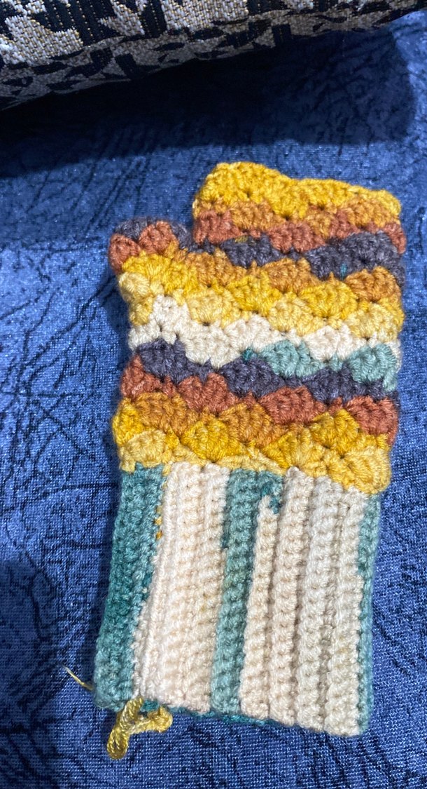 Nakışlı, krem, sarı, kahverengi ve mavi tonlarında çok renkli, dokulu fırın eldiveni.