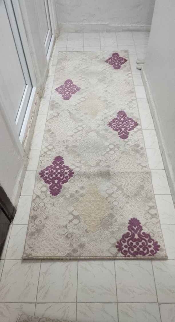Açık tonlarda, mor ve bej nakışlı desenlere sahip çok renkli geleneksel halı. Koridor ve antreler için uygundur. uzunluk 2.84 metre genişlik 80 cm