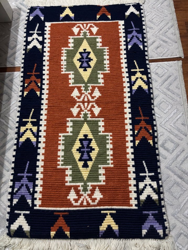 Bu geleneksel halı, geometrik şekiller ve püsküllü kenarlarla çok renkli koyu nakışlı desene sahiptir. Her odaya farklılık katar. Etamin üzerine yün ipşe işlenilmiştir el emeğidir astarlı kalın elyaflı seccade olarakta kullanılabilir