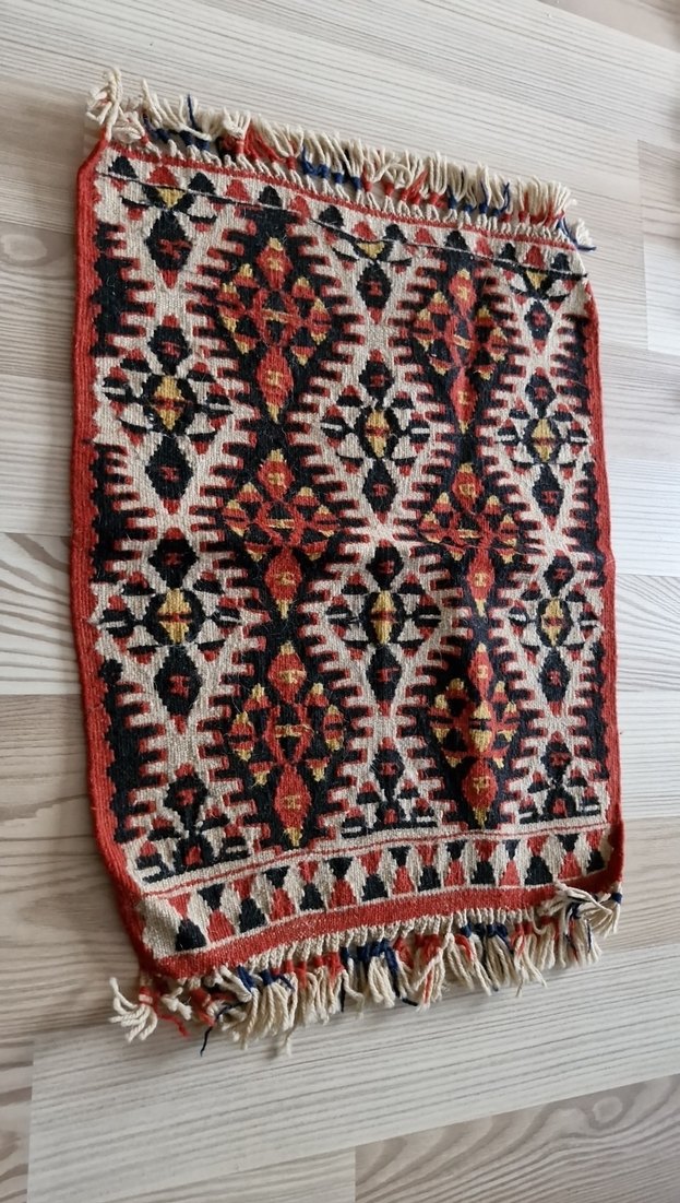 Bu geleneksel kilim, koyu ve çok renkli nakışlı desenlere sahiptir, zengin ve dokulu bir görünüm sunar. 60×42ebatları