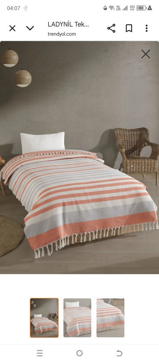 Nakışlı desenlere sahip, gri ve turuncu tonlarında çok renkli pike, püsküllü kenarlarıyla dikkat çekiyor. ️