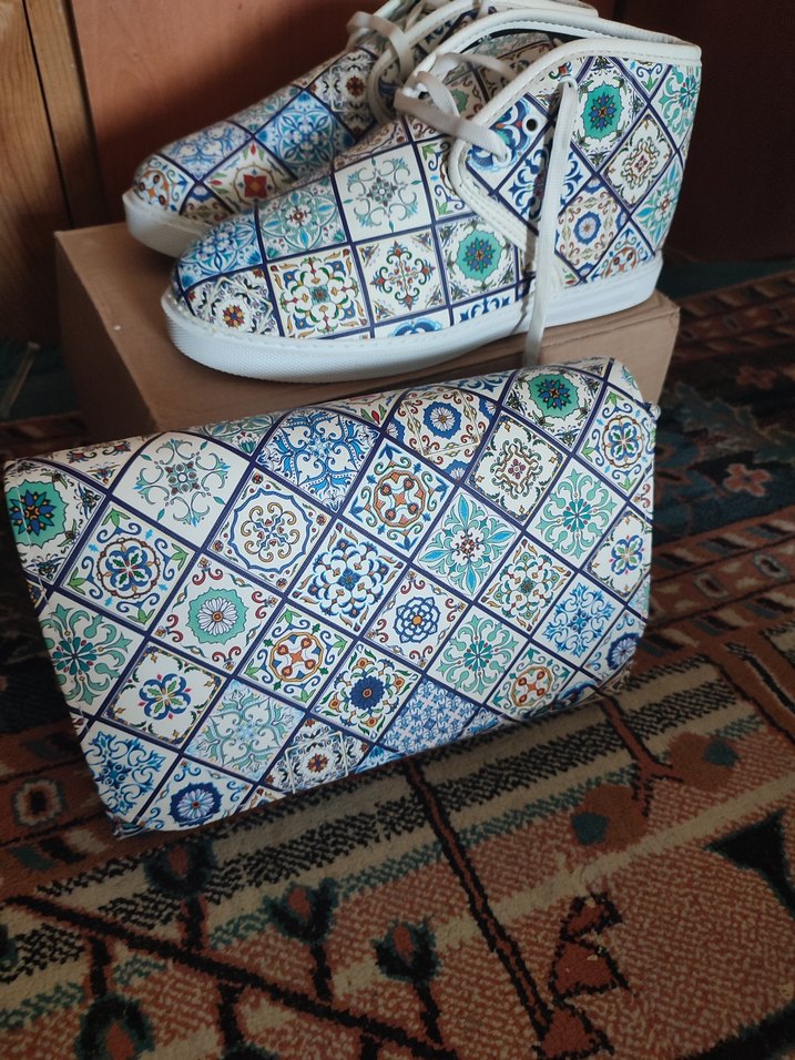 Nakışlı, çok renkli seramik desenli kumaşla yapılmış, dolgu topuklu ve tokalı kadın espadril ve uyumlu çanta seti. Bohem ve retro tarzda.