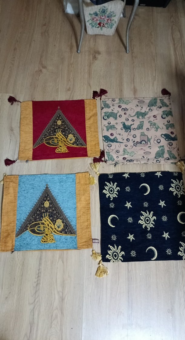 Nakışlı desenlere sahip, koyu ve canlı renklerde çeşitli geleneksel ve göksel motifler içeren kırlent kılıfları. Köşelerde püsküller bulunur.