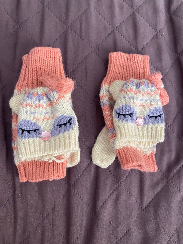 Bohem tarzda, pastel çok renkli nakışlı göz desenli, yumuşak örgü dokulu kız çocuk eldiveni.
