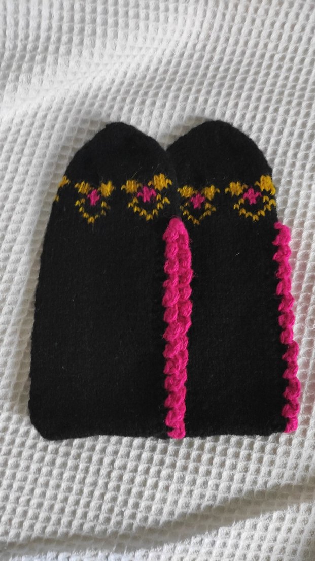 Koyu renkli, nakışlı ve örgü kız patik canlı pembe ve sarı detaylarla retro ve bohem tarzını yansıtıyor.