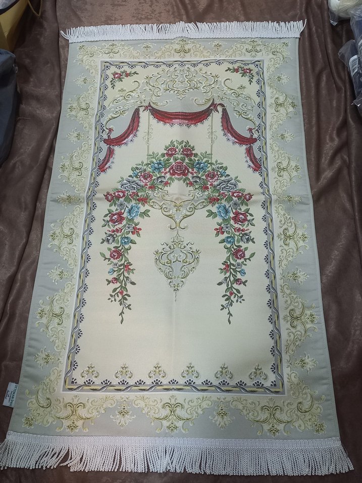Bu klasik halı, ipek seccade , nakışlı desenleri ve açık tonlarda çok renkli yapısıyla iki ucunda püsküller içerir. ölcü : 130*70 Sıfır üründür.