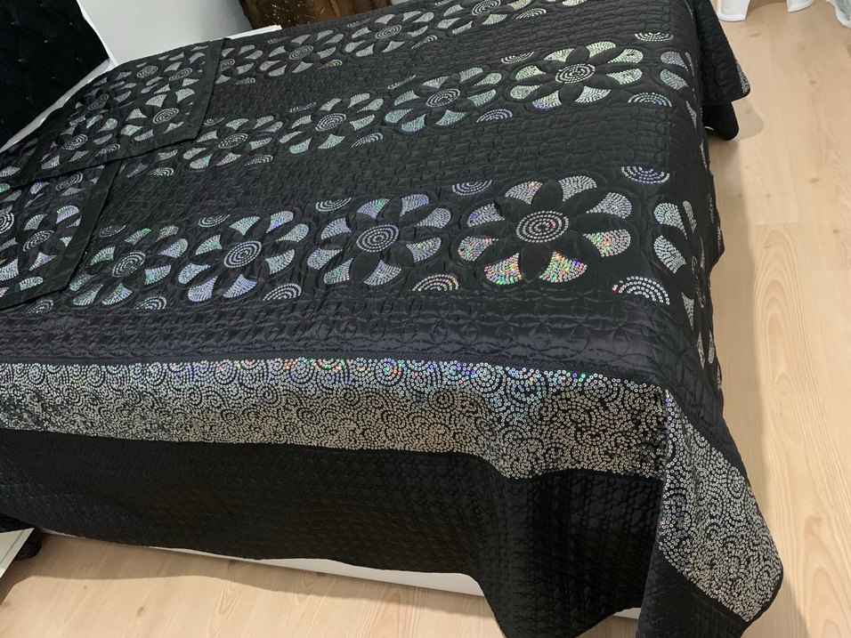 Koyu renkli bu yatak örtüsü, çok renkli nakışlı dairesel desenlerle dokulu ve derinlikli bir görünüm sunar.