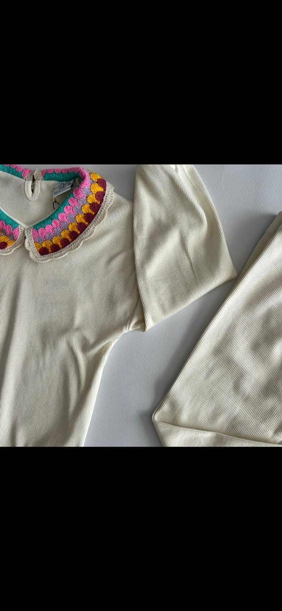 Renkli nakışlı yakası, kısa kollu ve bol kesimli kız bluzu. Yumuşak örme kumaştan, bohem tarzda ve pastel tonlarda. Krem renk takım bahar aylarının vazgeçilmezi olabilir