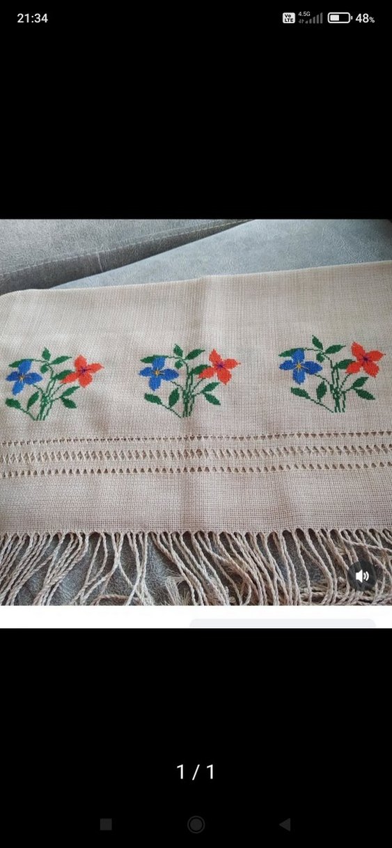 açık kahve taban üzerine mavi ve kırmızı nakışlı çiçek desenleri bulunan, püsküllü geleneksel tarzda masa örtüsü. altı işlemesi vardır el işi kaneviçe