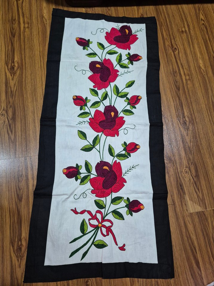 Nakışlı çiçek desenlerine sahip, koyu canlı renklerde geleneksel tarzda dekoratif masa örtüsü, siyah kenarlıklı. son 6 fotoğraf görseldir. komple elişidir