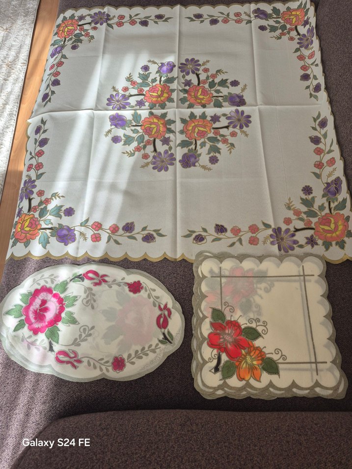 Çiçek desenli, nakışlı, çok renkli ve açık tonlarda masa örtüsü seti. Kenarları dalgalı ve klasik stile sahip.#dantel