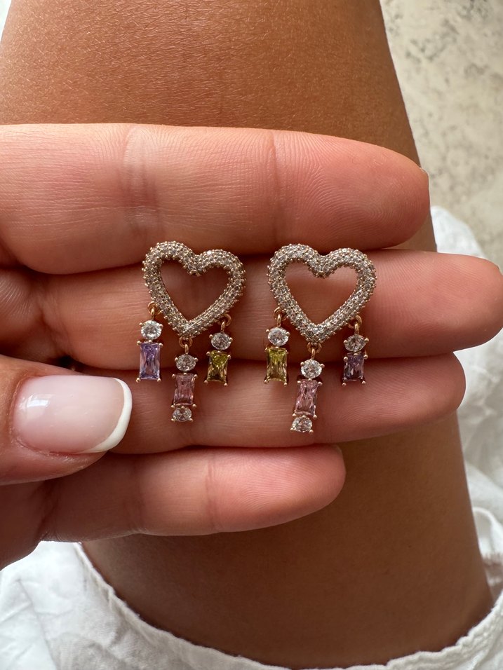 Nakışlı, çok renkli taşlarla süslenmiş midi kalp küpeler, romantik akşamlar için bohem tarzını yansıtır.