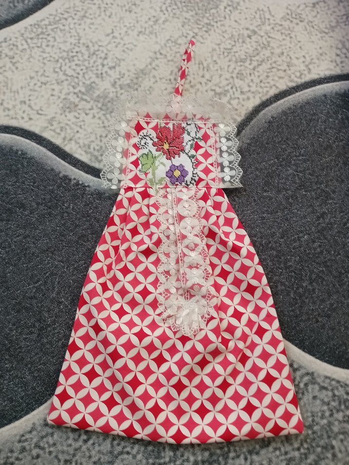 Nakışlı, çok renkli desenli ve dantel detaylı mutfak önlüğü, şık bir dokunuş sağlar.