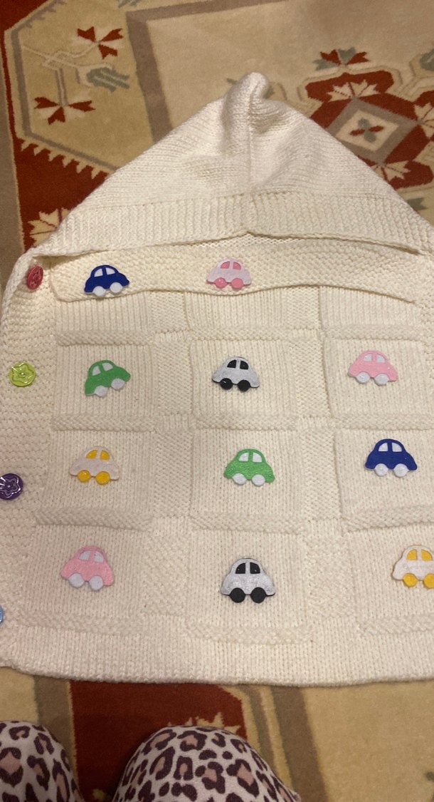 Pastel renklerde, küçük araba nakışlı çok renkli örgü bebek battaniyesidir. Yumuşak ve rahat, çocuklar için uygundur.