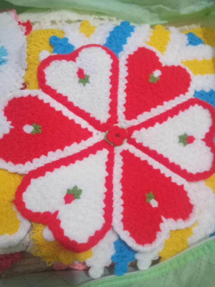 Nakışlı kalp desenleriyle çok renkli, örgü dokulu çocuk battaniyesi, canlı ve sıcak bir tasarıma sahiptir. ❤️