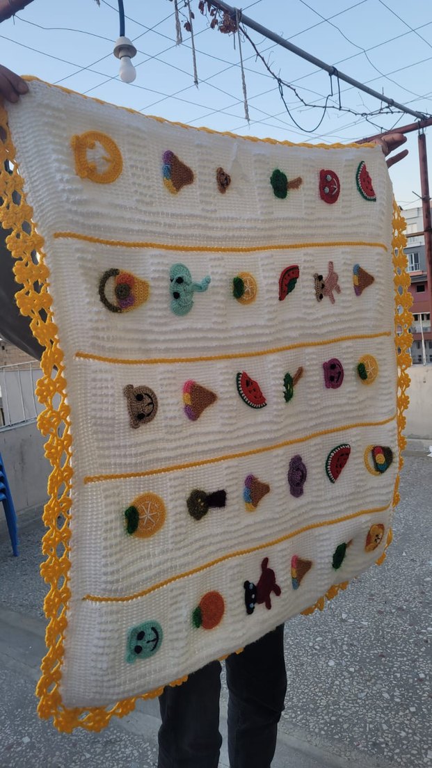 Çocuk battaniyesi, örgü dokusu ve çeşitli renklerde nakışlı desenlere sahiptir. Açık renkli çok renkli tasarımı ve sarı süslü kenarı bulunur.
