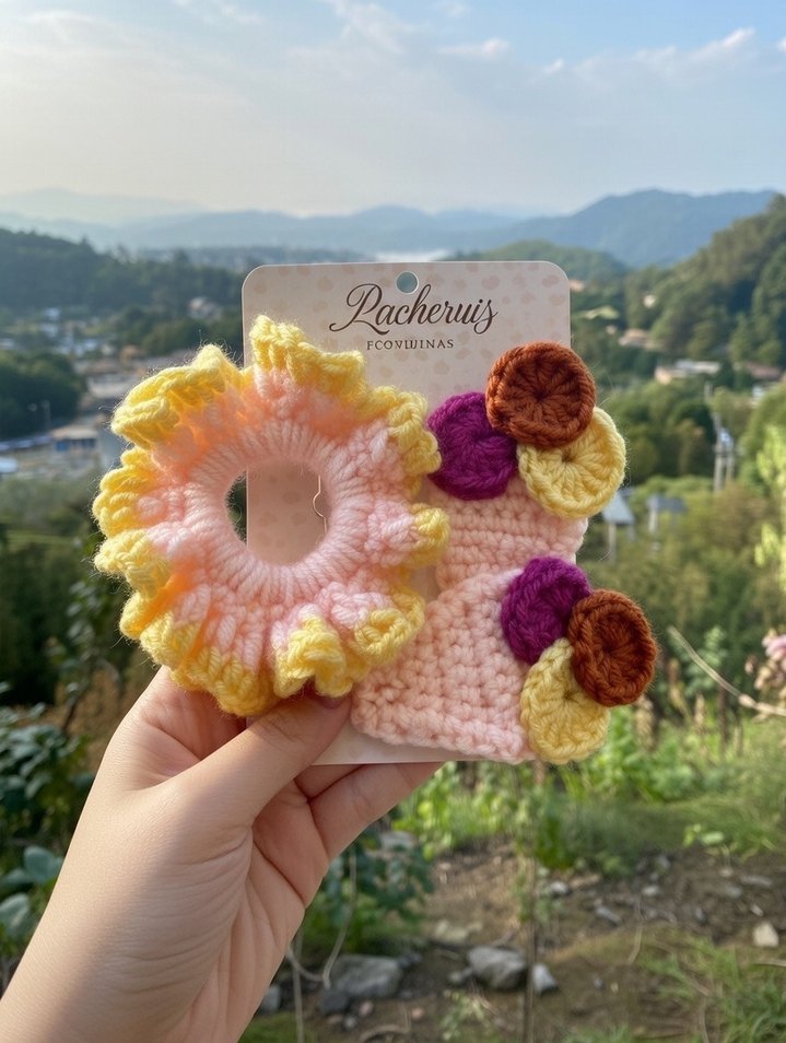 Nakışlı çiçek detaylı, pastel renklerde örgü çocuk saç aksesuarı seti, bohem ve retro tarz için uygundur.