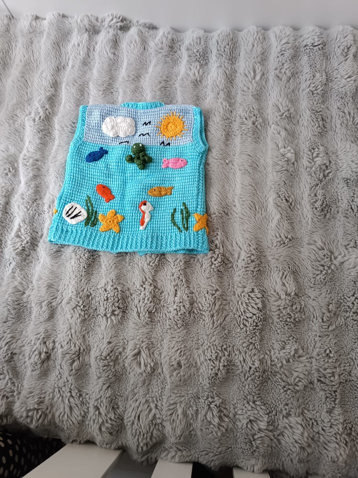 Nakışlı deniz canlıları ve güneş figürleri içeren pastel çok renkli örgü çocuk yeleği.