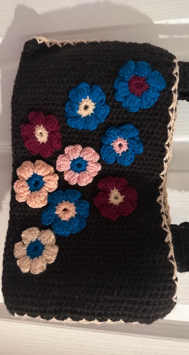 Kadın çantası, koyu renk örgü kumaş üzerine çok renkli nakışlı çiçeklerle bohem ve rahat stil sunar, günlük kullanıma uygundur.