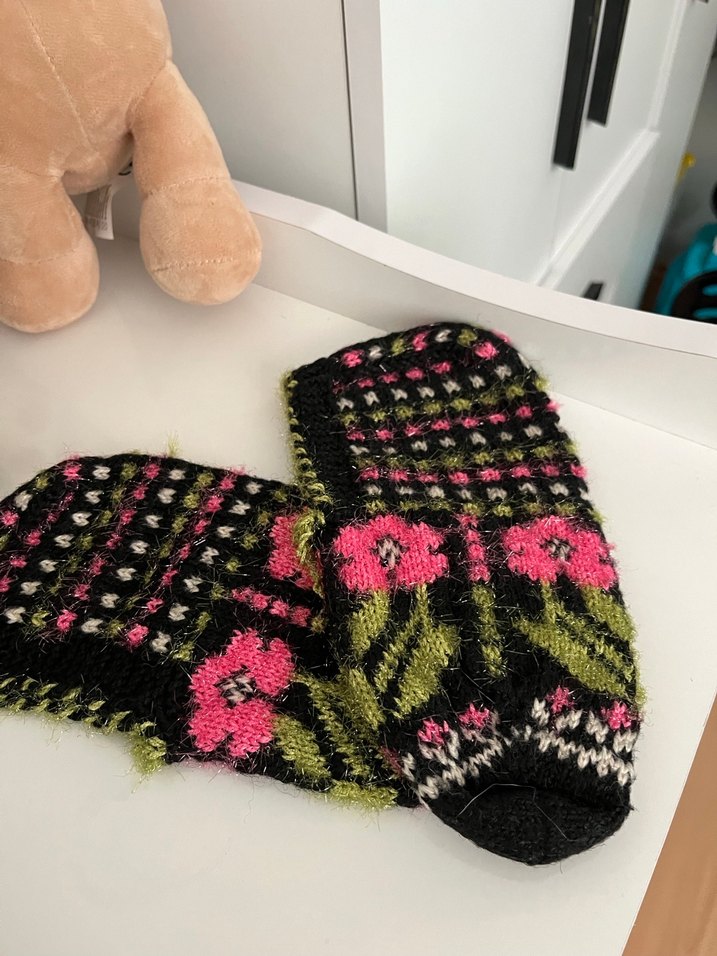 Nakışlı, çok renkli, koyu tonlarda örme patik bohem ve retro tarzda.