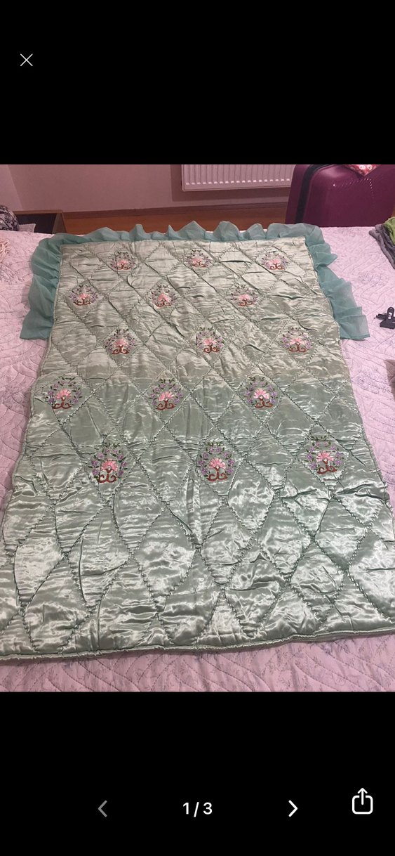 Pastel yeşil yatak örtüsü, nakışlı çiçek desenleri ve fırfırlı kenarıyla şık bir detay sunar.
