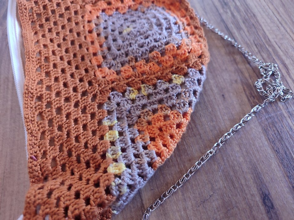 Gri, turuncu ve sarı tonlarında çok renkli nakışlı desenli, dokulu ve el yapımı telefon çantası. Zincir detayı bulunur.