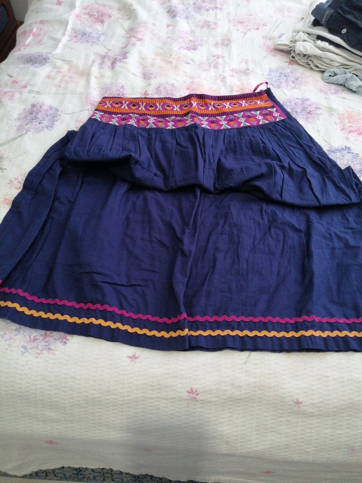 Bu bol kesim, uzun etek koyu renkte kumaş ve renkli nakış detayları ile bohem tarzına uygun, fırfırlı tasarıma sahiptir. Hiç kullanılmadı diyebilirim yan tarafta 2 adet iğne izi var